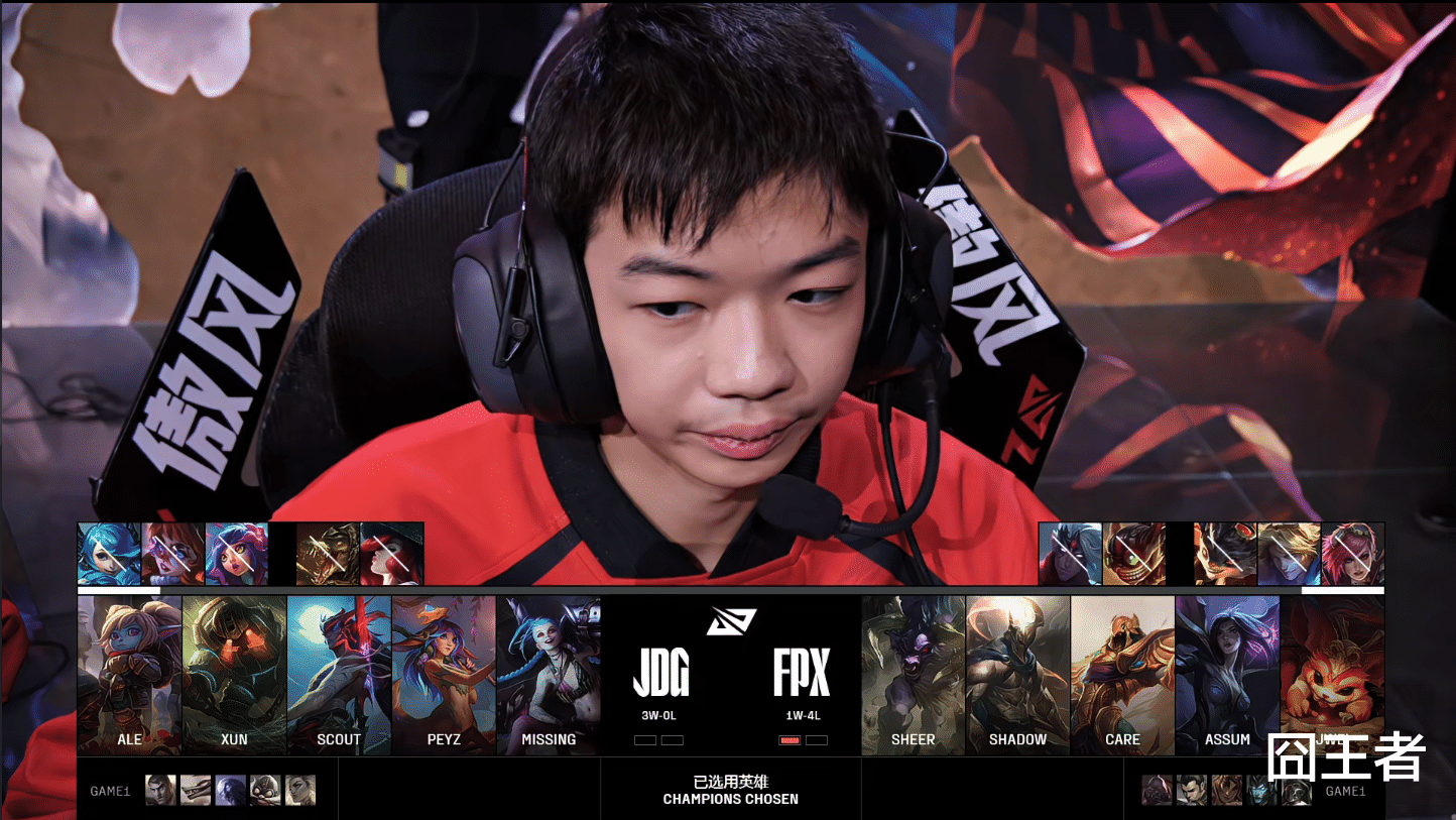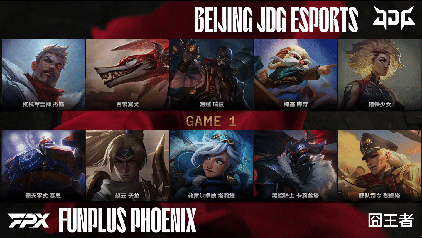 第一局比赛,JDG蓝色方,禁用妮蔻、格温、猪妹、泰坦、卡莎,选用杰斯、纳亚菲利、瑞兹、飞机、芮尔;FPX红色方,禁用蔚、伊泽瑞尔、兰博、韦鲁斯、炸弹人,选用赛恩、赵信、岩雀、滑板鞋、烈娜塔