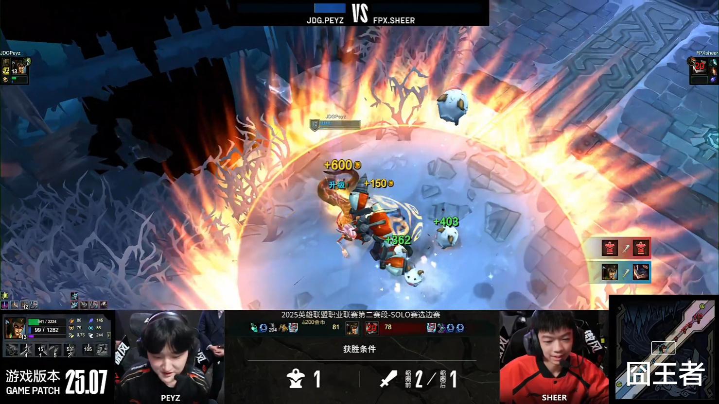 在SOLO选边赛中,Peyz卡西奥佩娅对阵sheer兰博。缩圈后,Peyz卡西奥佩娅冷静应对击败兰博,拿下胜利。JDG获得本场BO3首场选边权,JDG选择蓝色方。