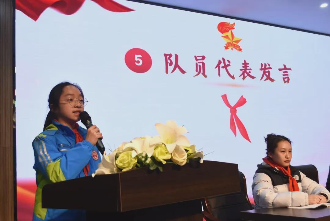 五五中队王玥然同学作为少先队员代表发言,以真挚的语言表达对祖国、对少先队的忠诚与热爱,展现新时代少年的蓬勃朝气。
