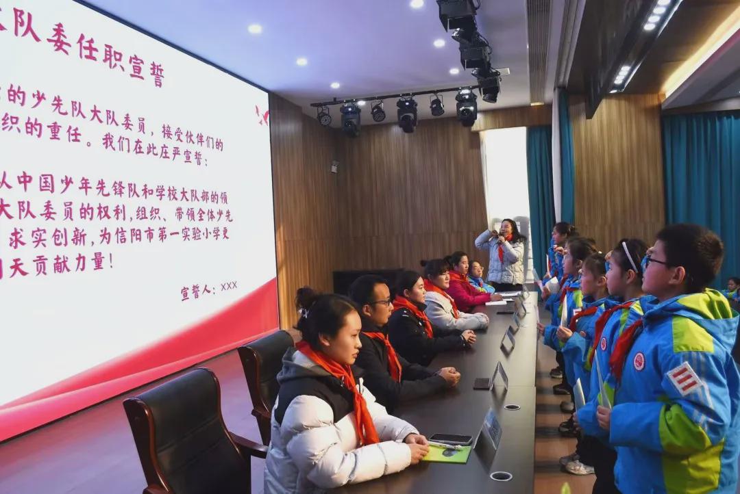 大会现场最令人激动的环节,莫过于新一届大队委任职仪式。学校领导为新当选的大队委佩戴标志、颁发聘书,见证他们接过责任的接力棒。在高校长的带领下,新一届大队委成员庄严宣誓,铿锵誓言回荡会场,既是承诺更是担当。随后,新一届大队委成员逐一自我介绍,充分展现做好少先队工作的信心与决心。