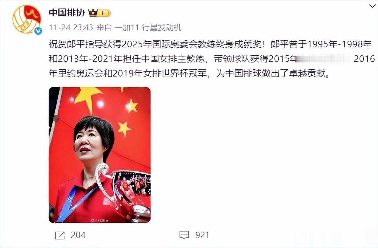 2025年11月24日,国际奥委会宣布,来自中国的排球教练郎平获得国际奥委会教练终身成就奖。