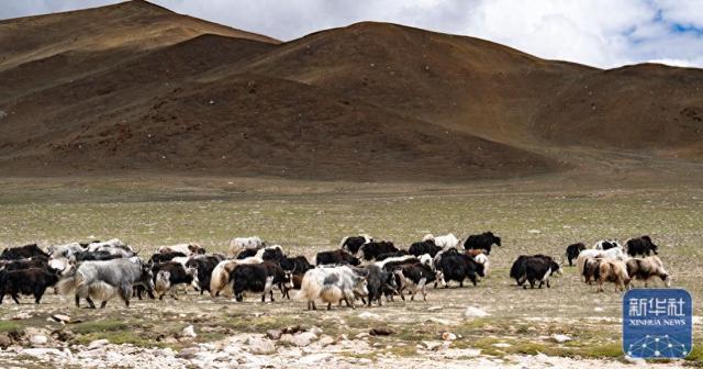 8月24日,一群牦牛行走在雅鲁藏布江源头附近的草地上。