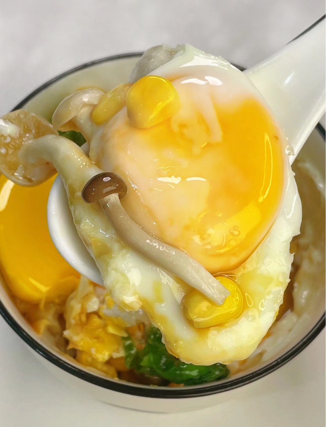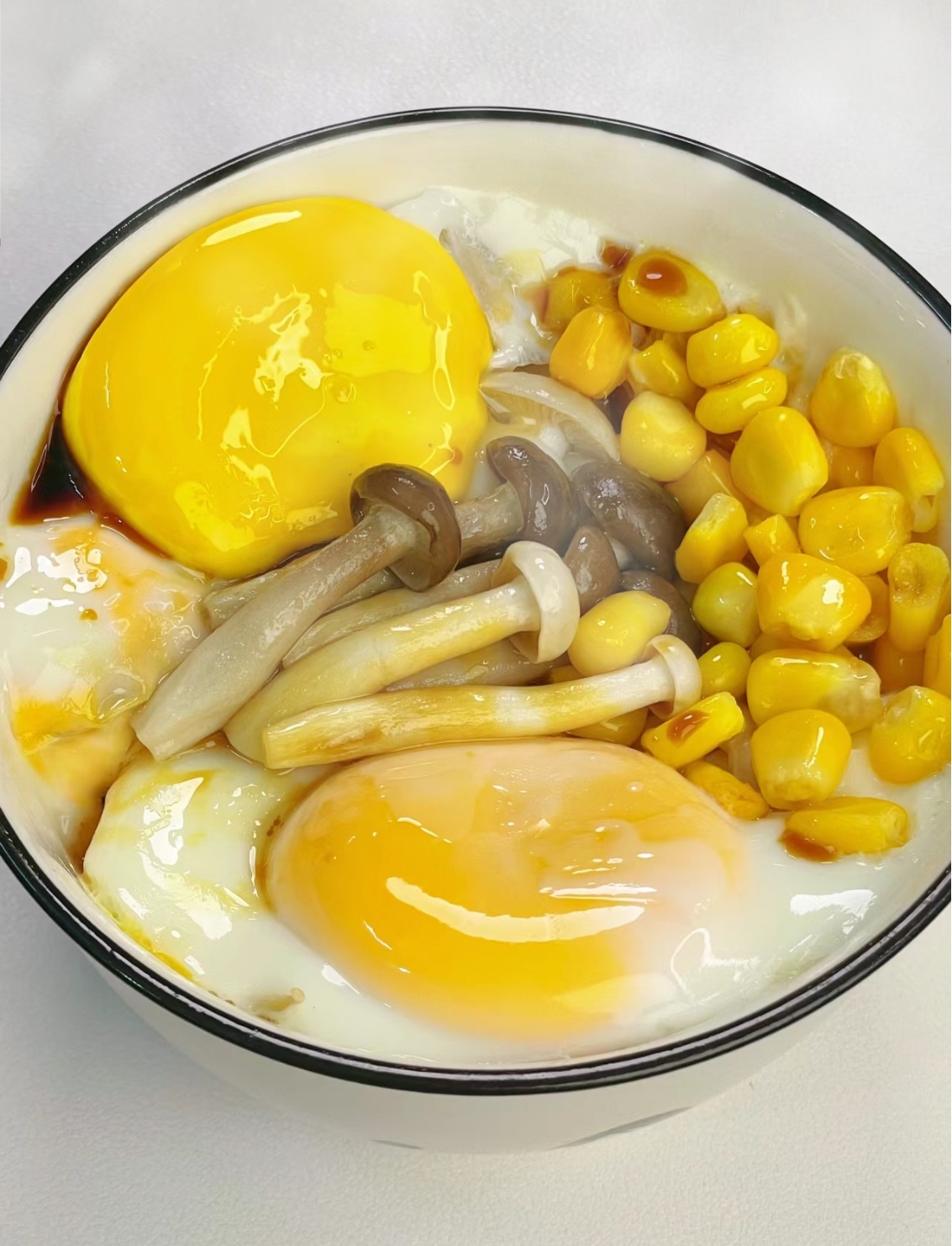 3. 叠加食材:紧接着,在生菜上摆放一层蘑菇片,再洒上一勺熟玉米粒,之后再铺上一层混合菌菇,创造出丰富的层次感。