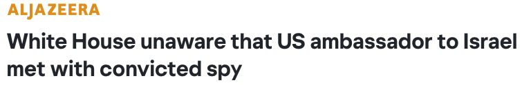 当地时间11月20日(周四),美国白宫表示,对今年早些时候美国驻以色列大使迈克·赫卡比(Mike Huckabee)与前美国海军情报分析员乔纳森·波拉德(Jonathan Pollard)秘密会面一事“毫不知情”。