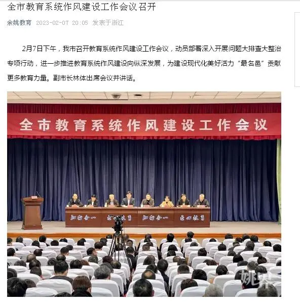 同年2月2日,余姚市教育局党委召开专题会议,强调面对全市人民对余姚教育的热切期盼,必须直面问题、内视警醒,誓以刮骨疗毒的决心,全面整肃系统中存在的问题和风险。