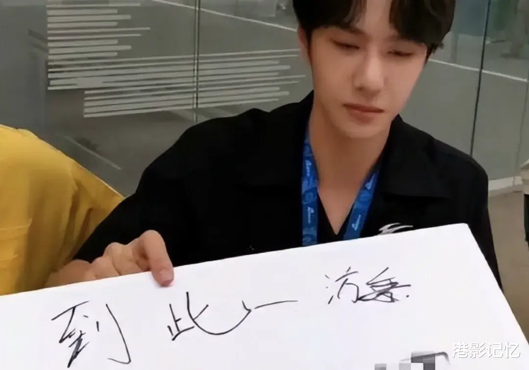 他曾在直播中,被主持人要求在纸板上,写下“到此一游”。
