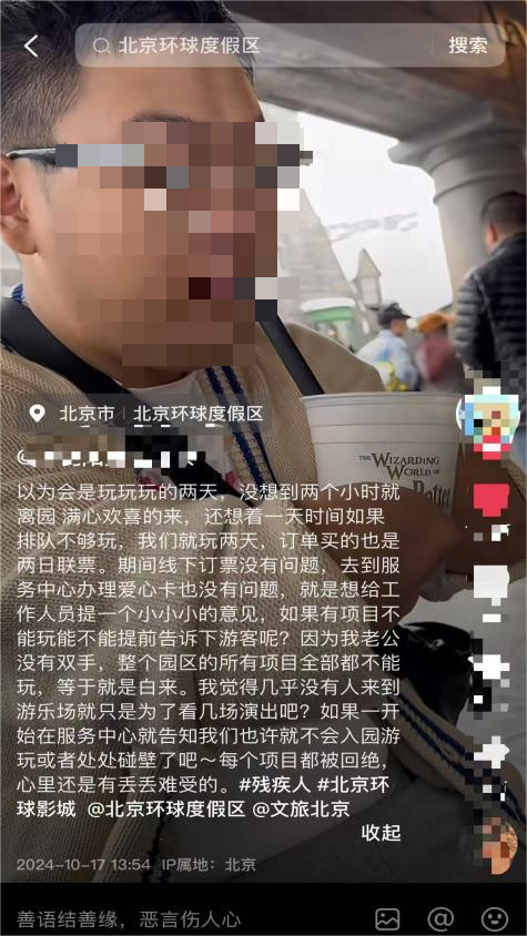 10月17日,有网友在社交平台上发文称,自己老公是残疾人,没有双手,他们一家人去北京环球影城游玩,在服务中心办理爱心卡时,园区工作人员并没有提前告知他们,残疾人大部分游玩项目玩不了,导致他们进入园区后,就只能看几场表演,大部分游乐设施都不让玩,他们一家只能扫兴而归。