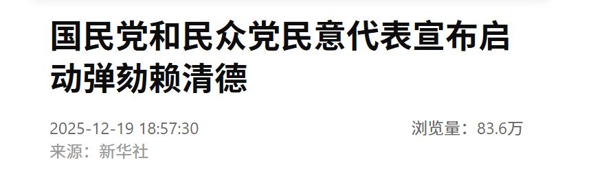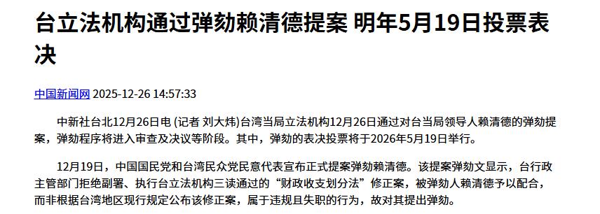 2025年12月26日,台湾地区民意机构就中国国民党与民众党联合提出的“弹劾台湾地区领导人赖清德”提案进行表决。