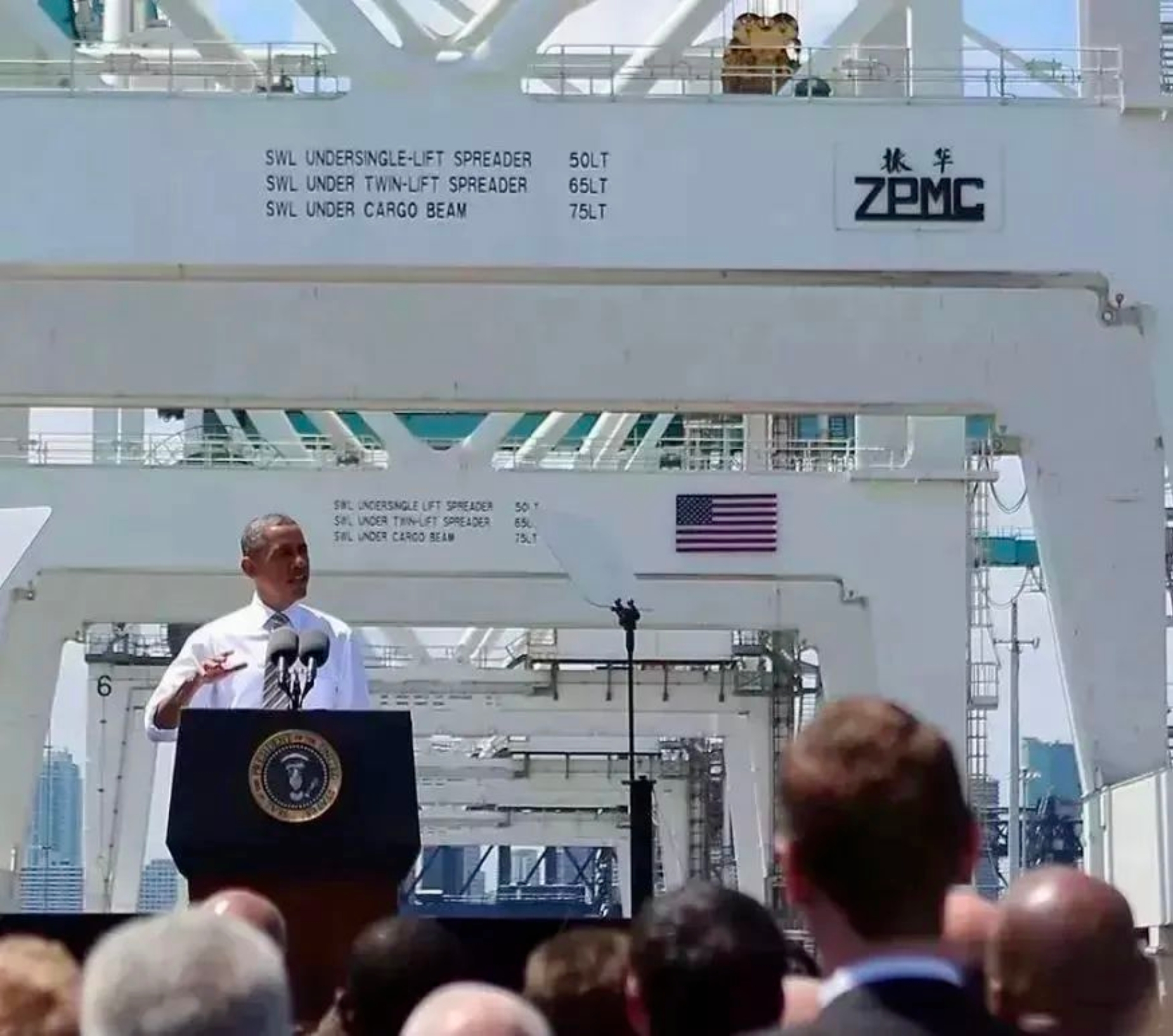 结果在他演讲的过程中,他身后起重机上遮盖设备标志的美国国旗被风吹落,露出了设备上的“振华”二字。这个“振华”乃是中国上海的振华重工。