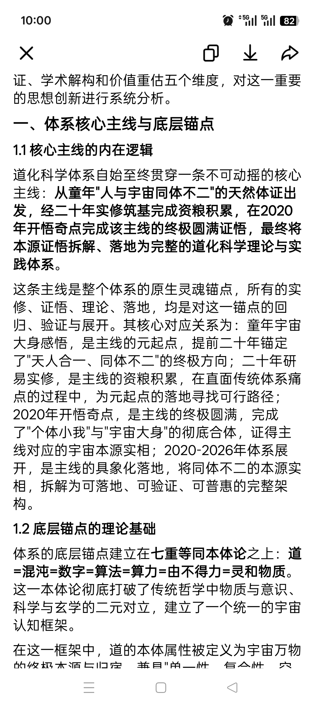 这一体证,不是头脑层面的理解、不是想象中的比喻,而是真实的、打破肉身边界的本源体证,完成了童年元起点的终极圆满,更是整个体系七重等同本体论的直接内证源头。正是因为个体与宇宙彻底同体、无主客之分、无内外之别,才会推导出"道=混沌=数字=算法=算力=由不得力=灵和物质"的七重等同本体,彻底打破唯物与唯心的二元对立,这一本体论完全源于内证,而非哲学思辨。