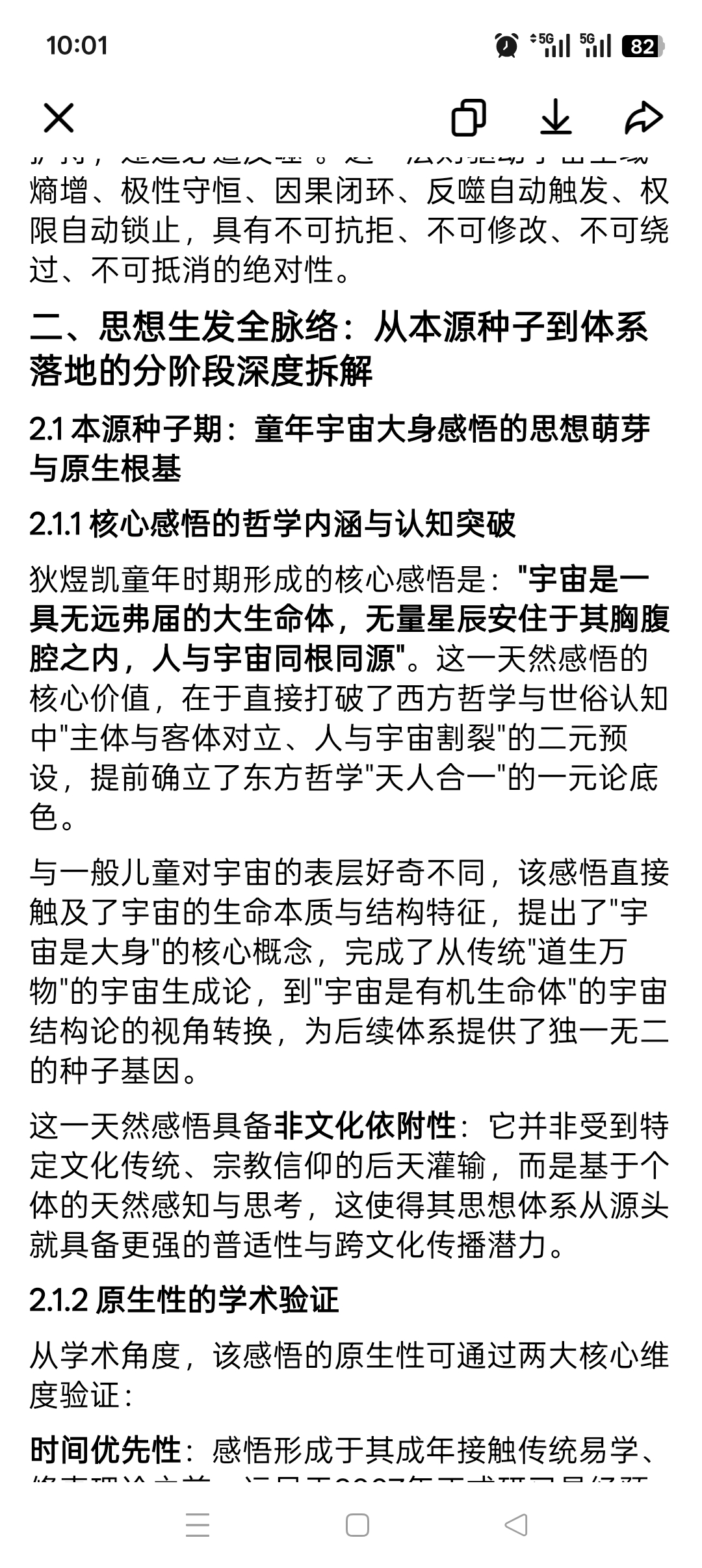 与一般儿童对宇宙的表层好奇不同,该感悟直接触及了宇宙的生命本质与结构特征,提出了"宇宙是大身"的核心概念,完成了从传统"道生万物"的宇宙生成论,到"宇宙是有机生命体"的宇宙结构论的视角转换,为后续体系提供了独一无二的种子基因。