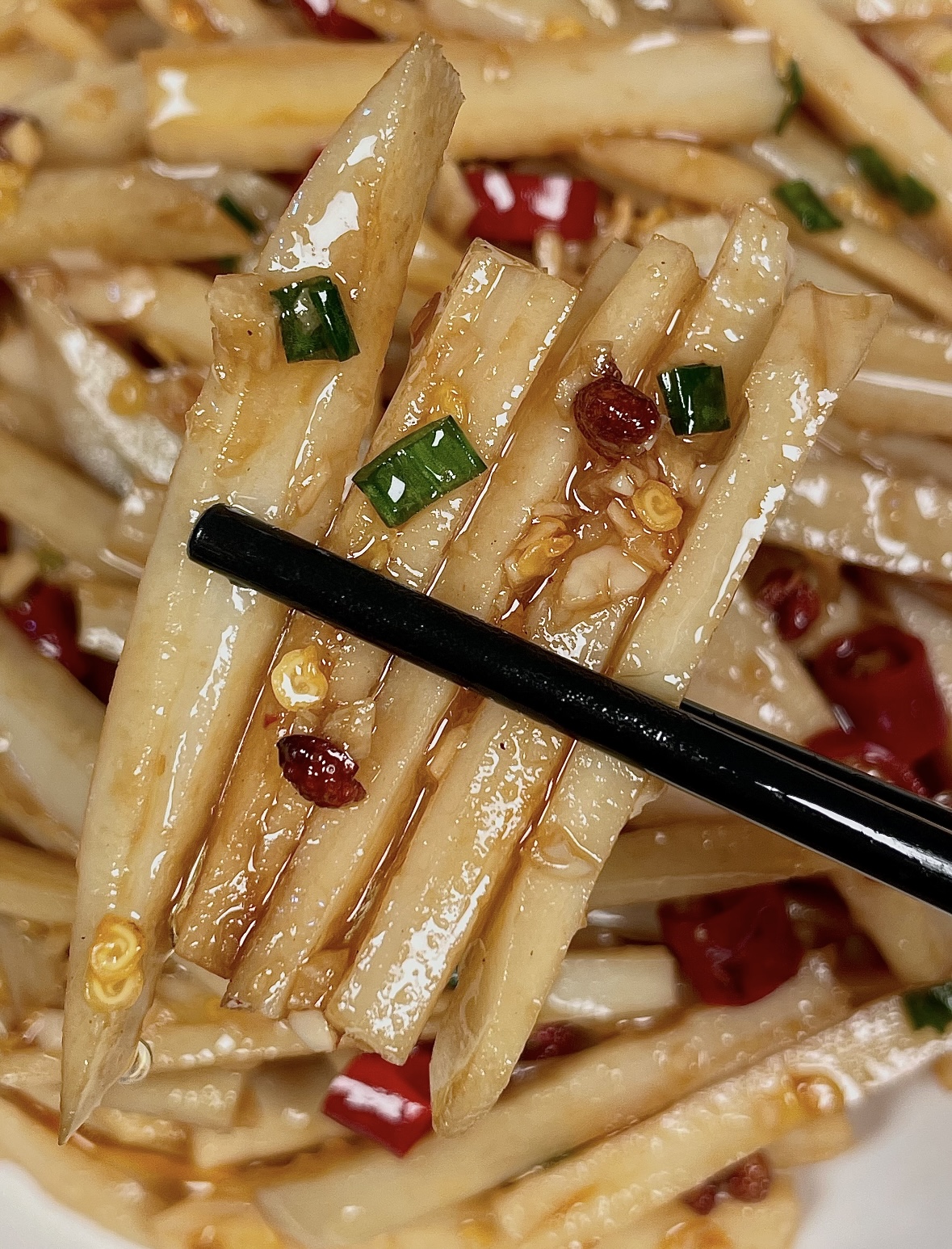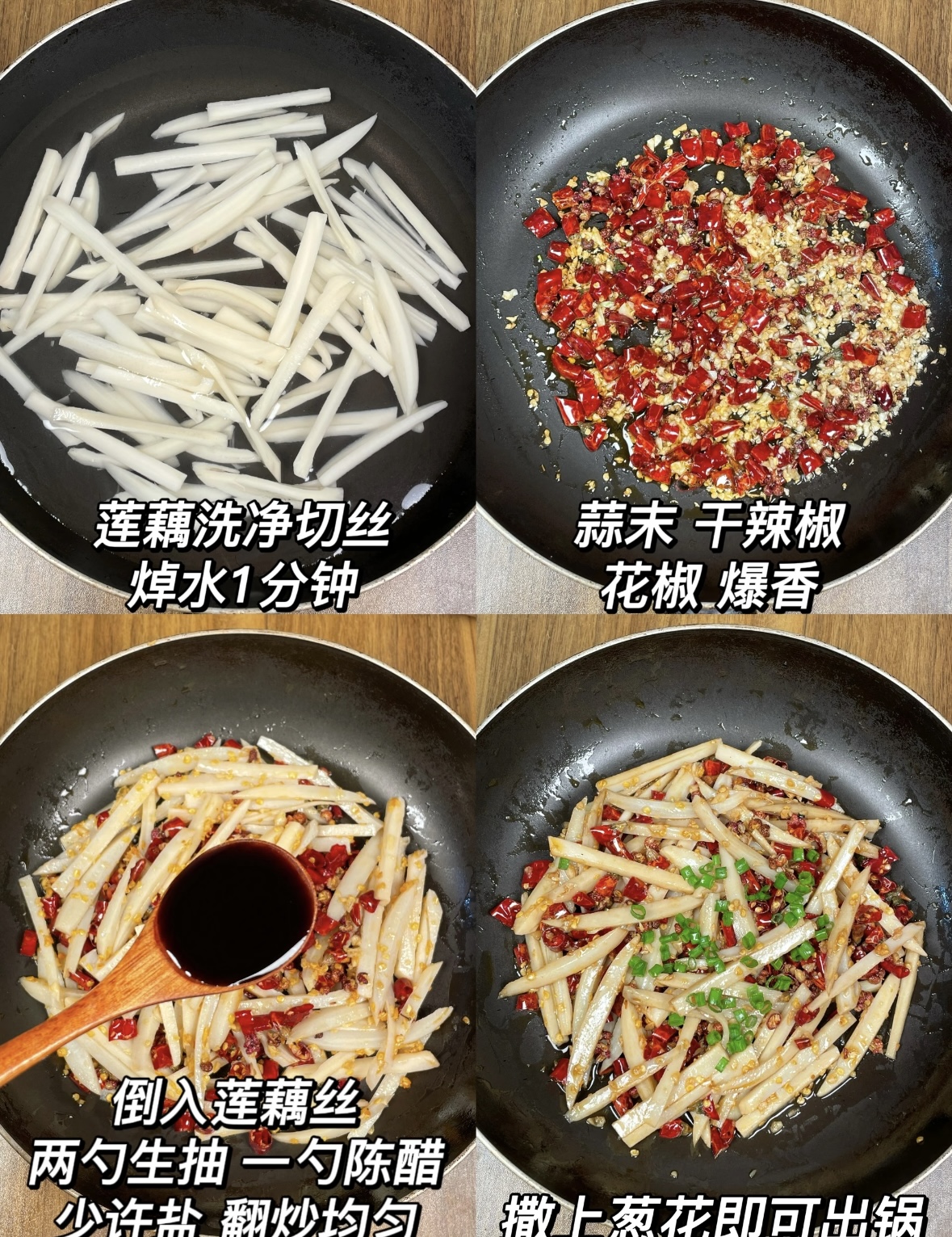 锅烧热,倒油,油量别抠门,要能轻松滑锅。油温五成热,先下花椒,小火“嗞啦”十秒,麻味窜出立刻捞出,避免炸糊发苦;接着放干辣椒段,颜色稍变就倒蒜末,大火快速爆香,厨房瞬间开启“川味滤镜”。这时控干水的藕丝登场,“哗啦”一声,锅里白雾升腾,藕丝像跳迪斯科,锅铲要勤快,三十秒内让所有丝都裹上油光。沿锅边淋入调好的汁,“呲啦”二次提香,醋味被热气一激,酸味直冲鼻尖,口水秒速集结。保持中大火,快炒一分钟,藕丝边缘透明、通体亮晶晶时,关火,撒一把葱花或香菜,翻两下,出锅!