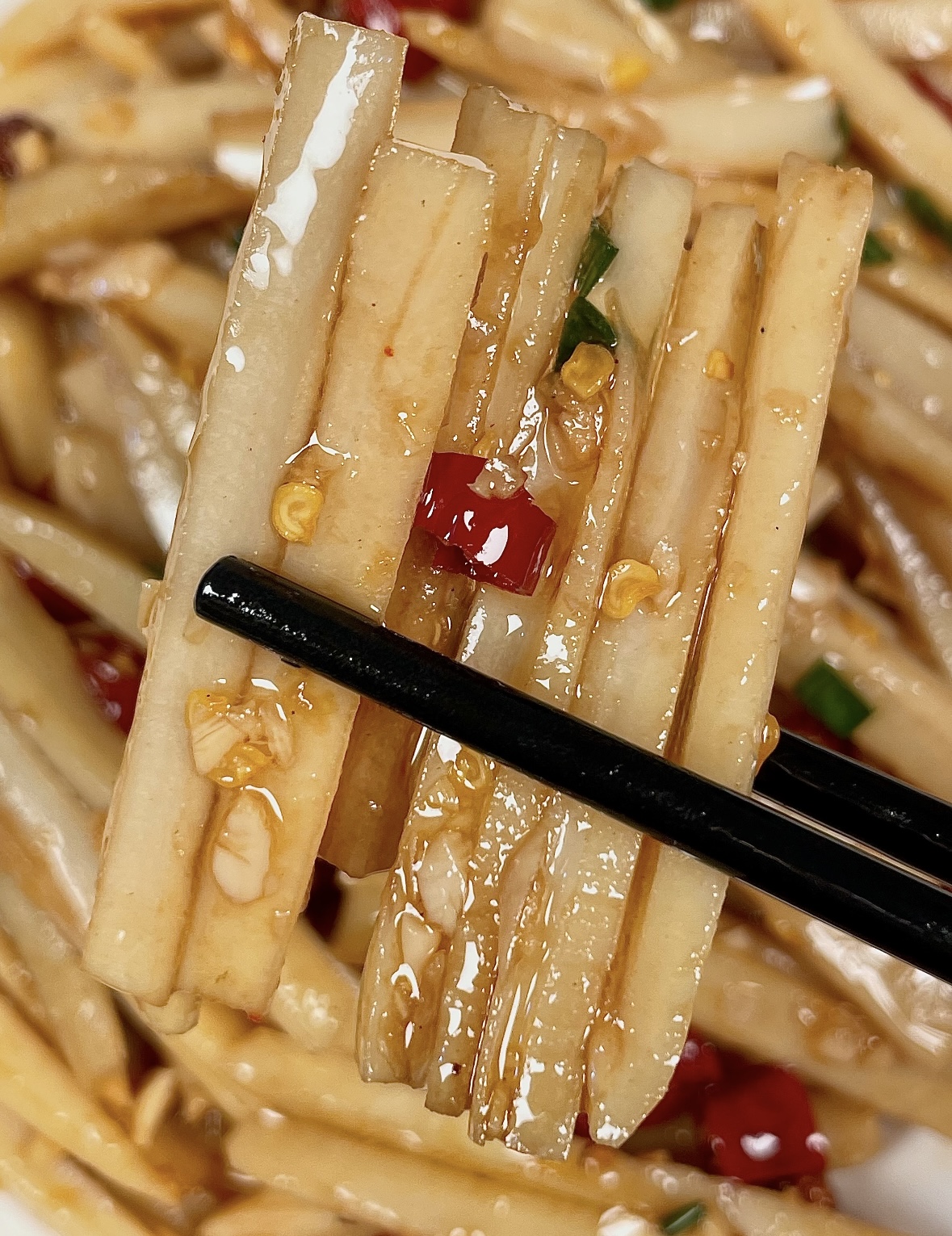 配料就是“酸辣铁三角”:干辣椒、蒜末、花椒。干辣椒用剪刀斜剪成段,籽留不留看你能不能吃辣;蒜拍扁切末,别剁成蒜泥,保留点小颗粒才香;花椒一小撮,青红皆可,喜欢麻味就多点,怕麻就少一点,但别省,少了就像相声没包袱。再来个“隐藏嘉宾”——白醋两勺、生抽一勺、糖半勺、盐少许,提前兑成汁,省得待会儿手忙脚乱。藕丝想更亮眼,可以切点青椒丝或胡萝卜丝当配色,纯属颜值加分项,不强求。