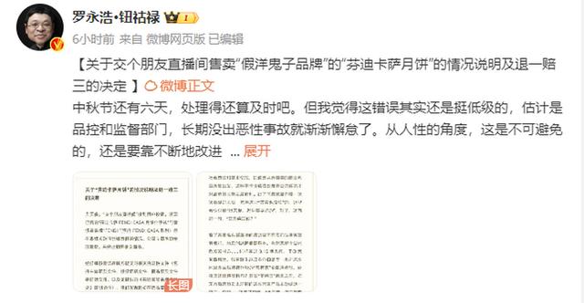 11日下午,针对直播间售卖芬迪卡萨月饼一事,罗永浩在微博发文称:“错误其实还是挺低级的,估计是品控和监督部门,长期没出恶性事故就渐渐懈怠了。”他表示:“ 作为交个朋友聘请的首席监督官,我和公司一起,向购买了假洋鬼子品牌月饼的消费者诚挚致歉,退一赔三的钱款大概会在十个工作日内自动到账。 ”