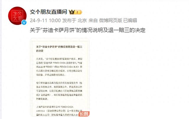 9月11日,交个朋友直播间发布《关于“芬迪卡萨月饼”的情况说明及退一赔三的决定 》,表示几天前,“交个朋友直播间”接到用户投诉,发现已售的“芬迪卡萨 FENDI CASA 月饼伴手礼”与奢侈品品牌“FENDI”(包括 FENDI CASA 系列)存在品牌关联性涉嫌造假的情况。公司立即启动专项调查,并停止销售相关商品。