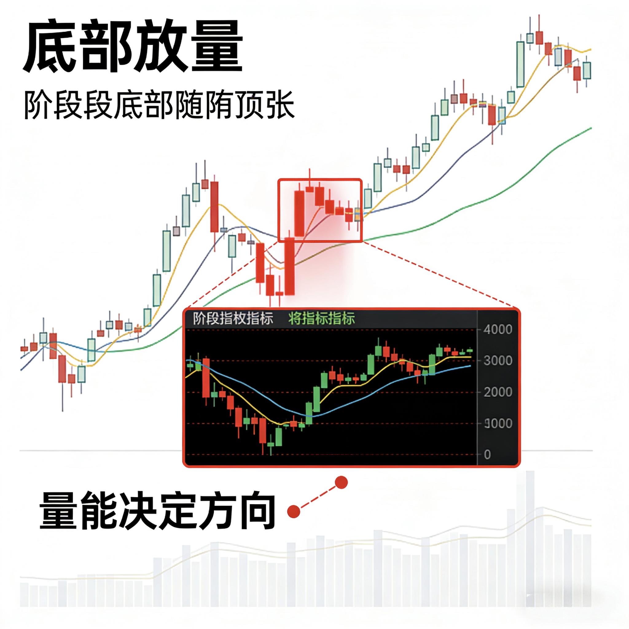 二、成交量:看清资金的“心电图”“量能决定方向”,这是股市的铁律之一。相比顶部放量,底部放量的信号更具价值——如果个股在阶段性底部出现明显放量,甚至伴随涨停板,往往说明有主力资金进场,做多意愿强烈。