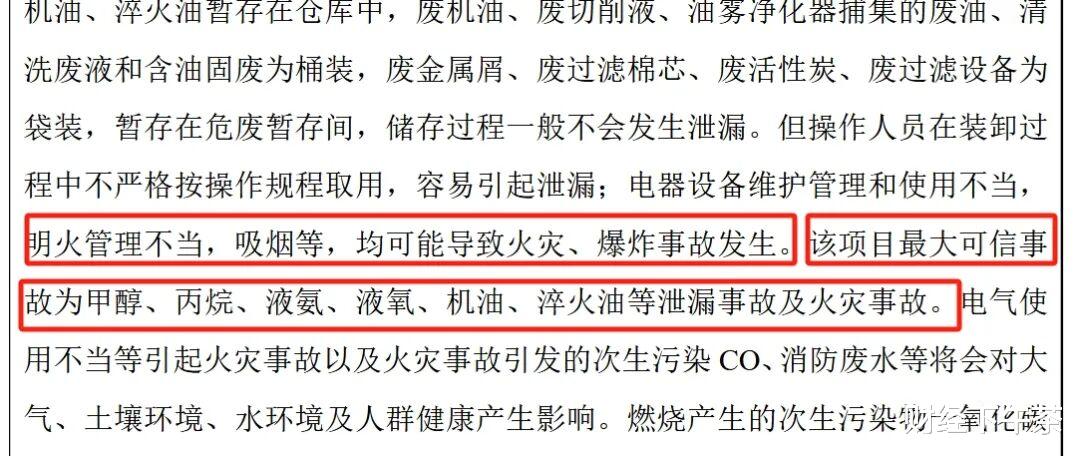 在生产过程中,冈田智能厂区存放有包括甲醇、机油、丙烷乃至废机油等易燃物。上述冈田智能的项目环境评估报告称,“明火管理不当,吸烟等,均可能导致火灾、爆炸事故发生。该项目最大可信事故为甲醇、丙烷、液氨、液氧、机油、淬火油等泄漏事故及火灾事故”。