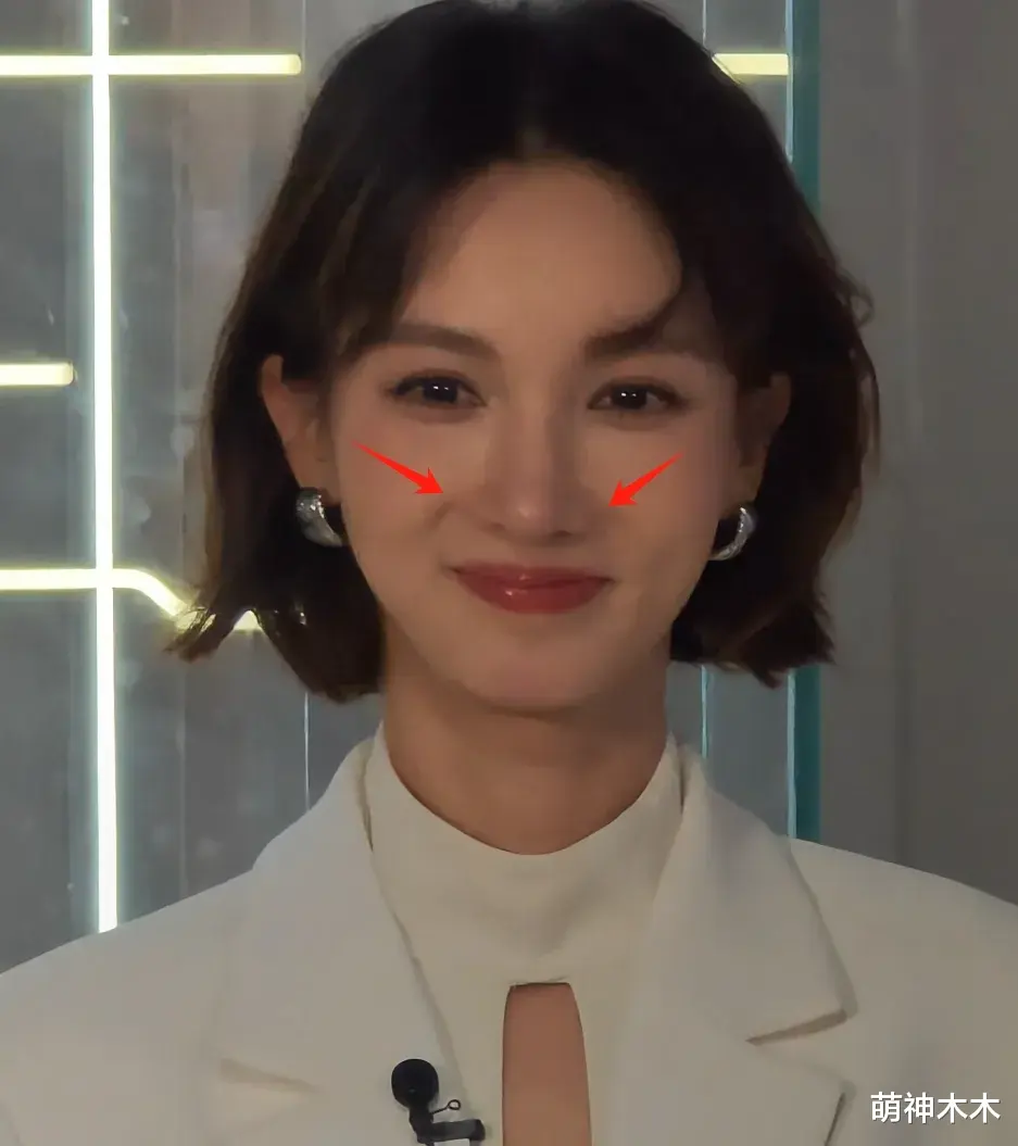 只是,当金晨做表情,比如微笑或者说话的时候,她的鼻子就变得异常了。从照片中可以看到,她的鼻头虽然圆润了,但是鼻孔却变得一高一低,格外抢眼。她左边的鼻孔向上翘,有一个明显的倾斜角度,这让她的整张脸都变得不对称。