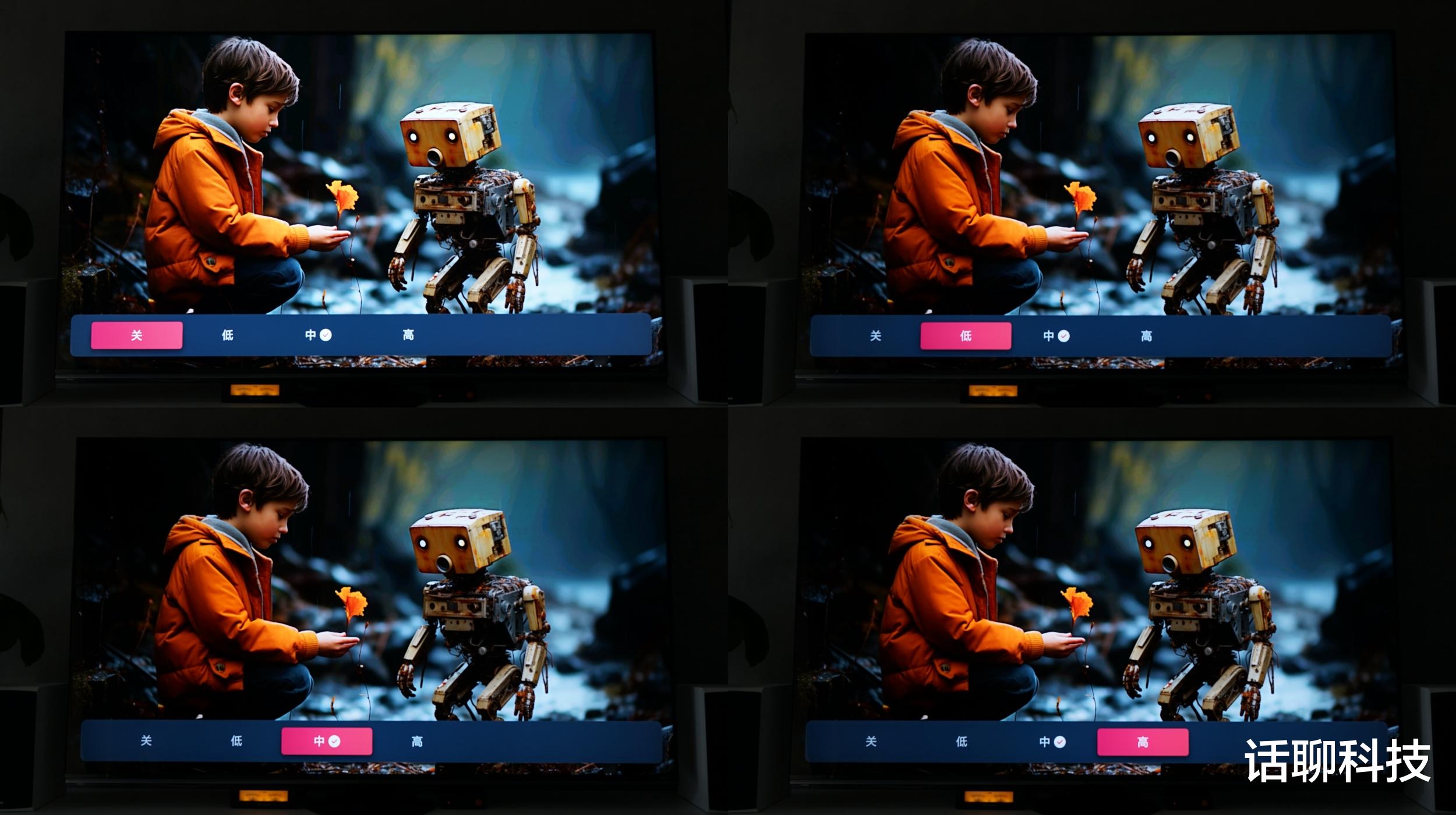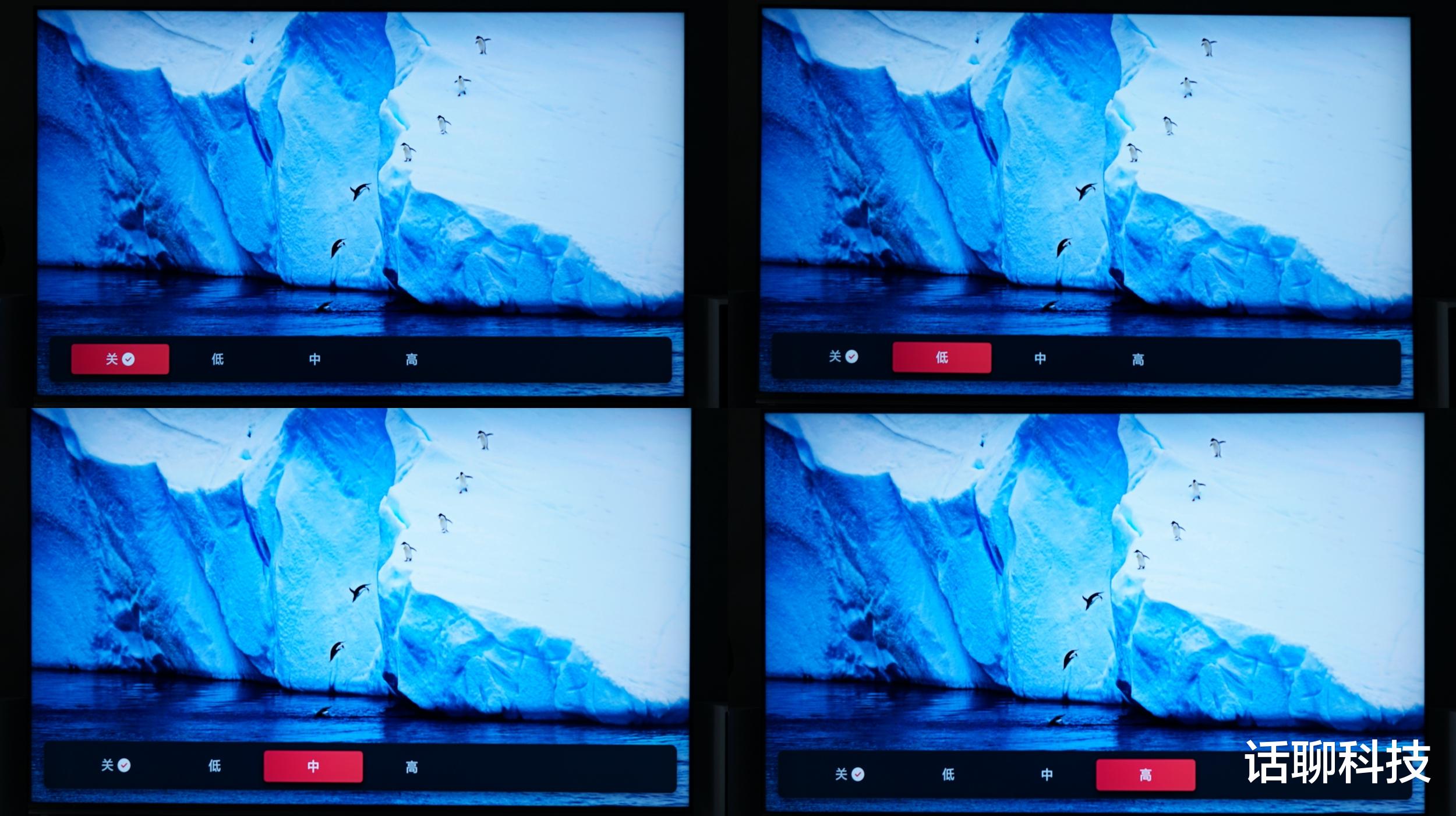 就说区域控光参数,有关、低、中、高四个档位可选。对于观看电影大片,开启高控光可以获得更大的动态对比度,让画面层次感更强;而对于观看新闻、娱乐节目,关闭区域控光可以让整体画面保持更明亮状态。下图是同亮度下,相机参数完全相同的情况下四个档位实拍画面的对比。