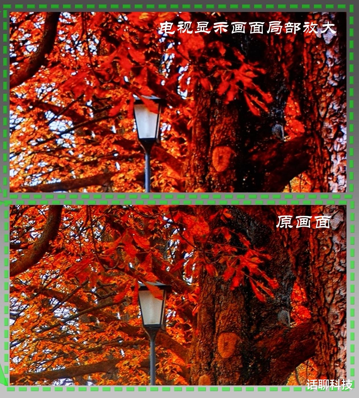 比如,显示秋季红叶浸染堤岸的画面。尽管整体背景以红色为主,但色彩之间侵染很少,隐匿在红叶之间的白色灯罩路灯放大显示依然细节很清晰、色彩很自然。