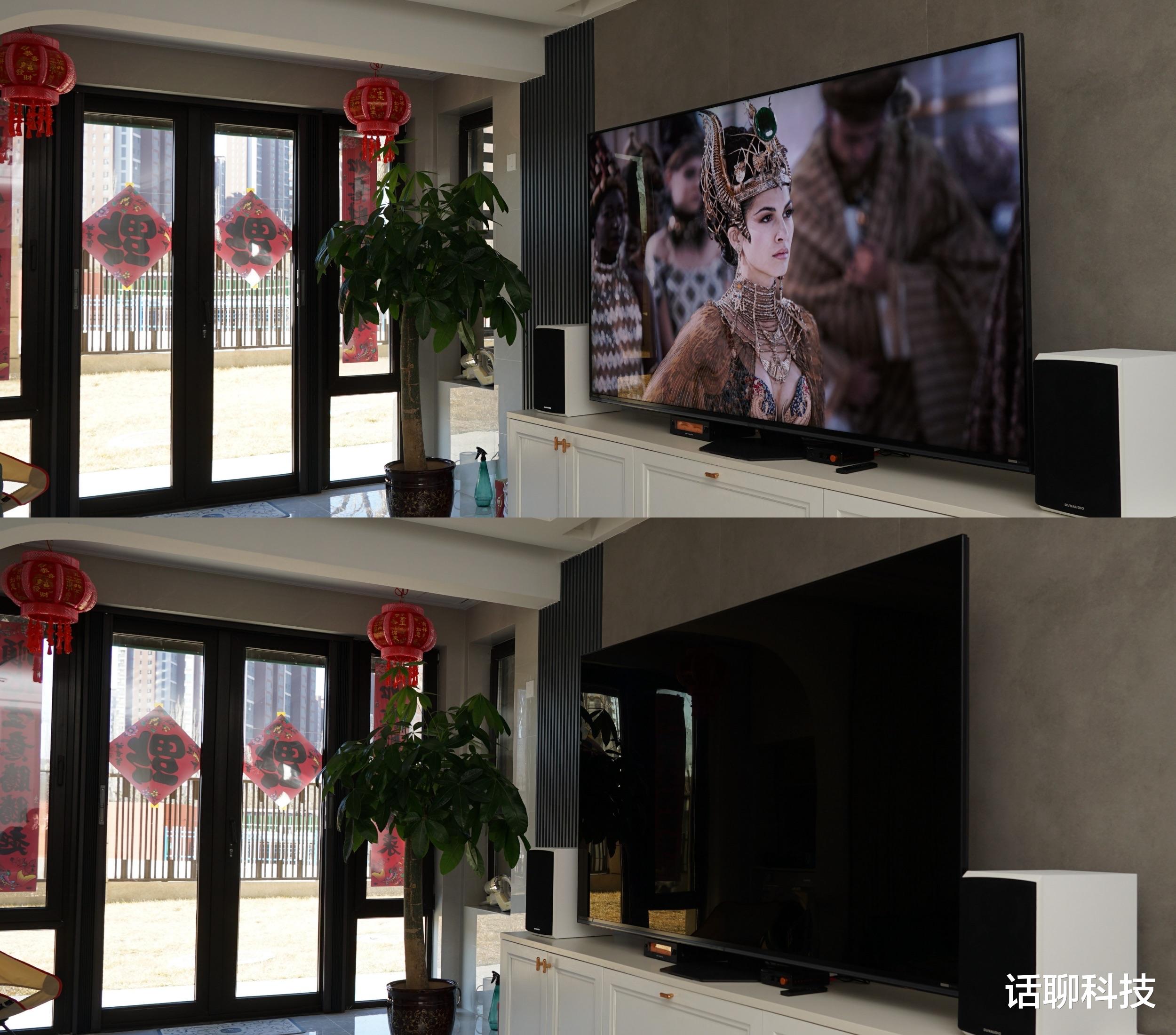 但开启峰值亮度“高”档位模式,并把电视亮度调到最高,在看电影或者追剧时观看光线明暗快转的画面,比如从阴暗的室内冲到阳光刺眼的室外;科幻片战斗场景大爆炸的画面,就会真有那种让瞳孔一缩的感觉,带来的感官刺激更明显。这种瞬间给人极明亮感觉,本身就是Mini LED技术的一种优势,此处为了展示的更真切,采用了固定ISO、光圈和快门的方式拍摄。