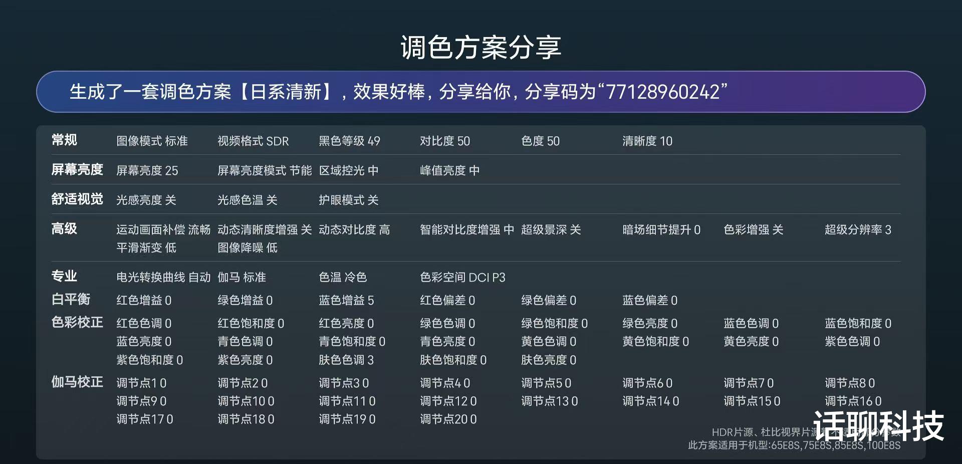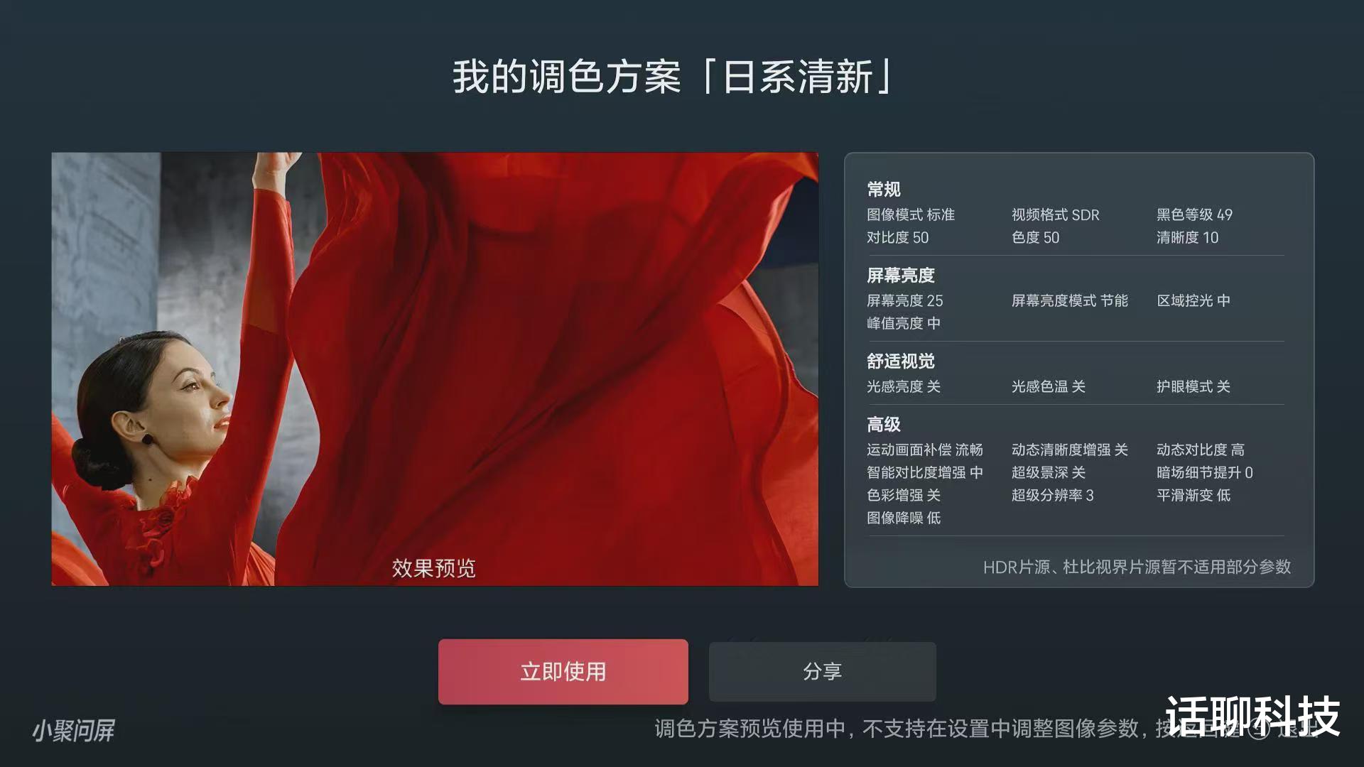 生成的方案可以本地保存,也能直接分享给同型号电视用户,异地的同一款电视看同一部电影,也能实现眼见相同、感同身受。