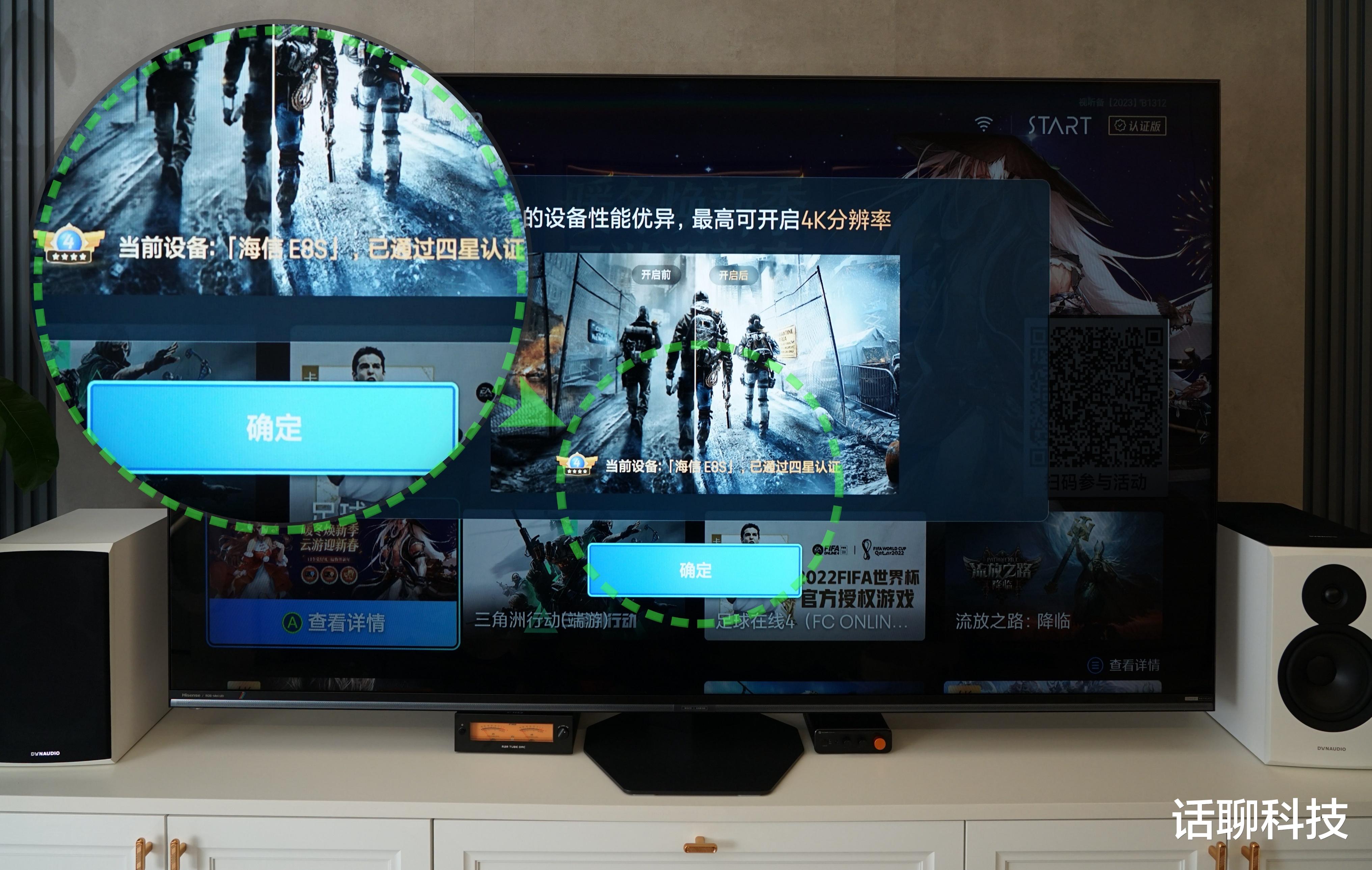 至于其硬件性能,官方标称支持4K@180Hz原生高刷,屏幕延迟低至5ms,已经是达到电竞显示器的水平。并且海信E8S通过了腾讯START云游戏认证。