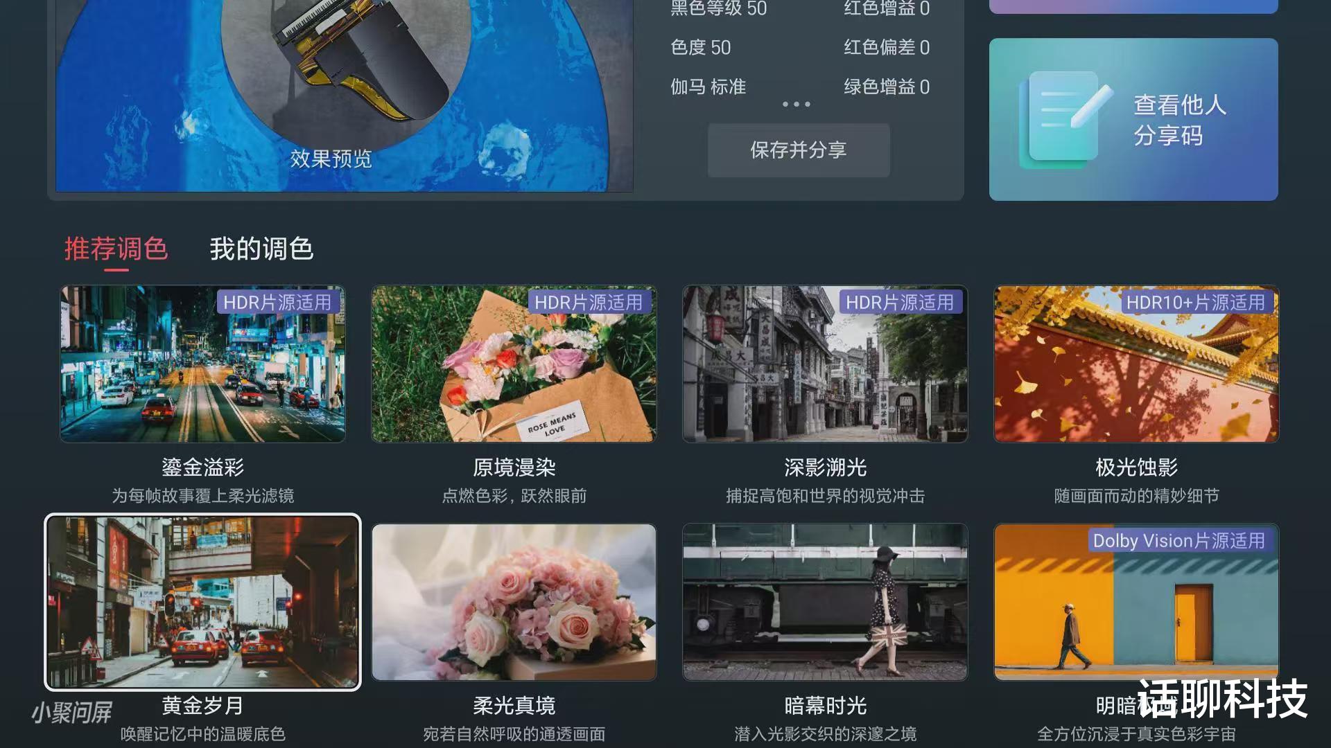 光影秒控台不仅能直观看到当前画面的所有参数设置,而且还能直接调用推荐的色彩方案,实现类似富士相机的滤镜功能,以更好营造观影氛围感。