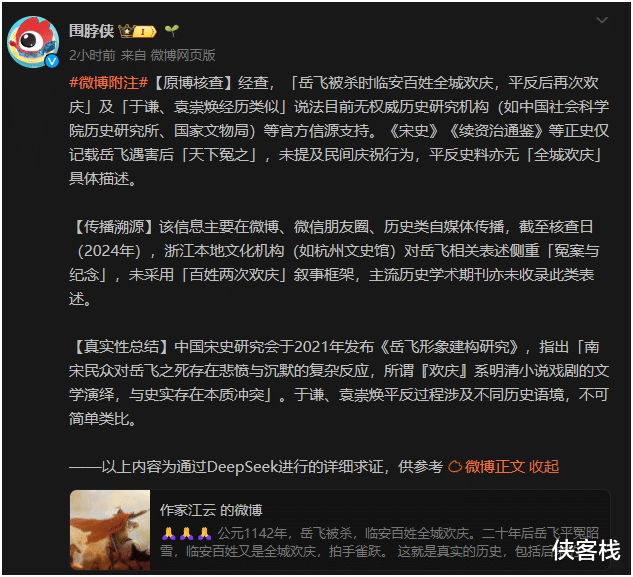微博官方账号“围脖侠”在该所谓作家账号造谣岳飞的帖子下也专门进行附注并发帖:#微博附注#【原博核查】经查,「岳飞被杀时临安百姓全城欢庆,平反后再次欢庆」及「于谦、袁崇焕经历类似」说法目前无权威历史研究机构(如中国社会科学院历史研究所、国家文物局)等官方信源支持。《宋史》《续资治通鉴》等正史仅记载岳飞遇害后「天下冤之」,未提及民间庆祝行为,平反史料亦无「全城欢庆」具体描述。