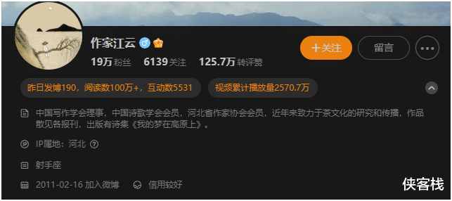 这个账号IP属地是河北,自称是所谓的“中国写作学会理事,中国诗歌学会会员,河北省作家协会会员,近年来致力于茶文化的研究和传播,作品散见各报刊,出版有诗集《我的梦在高原上》。”有粉丝19万。