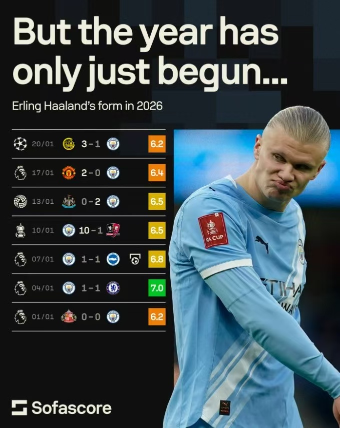 值得注意的是:本场比赛哈兰德未能打破进球荒,本场赛后评分也仅有6.2分。自从进入2026年,曼城的7场各项赛事他仅是在对阵布莱顿比赛中打进一粒点球,且7场比赛sofa评分最高也只有7.2