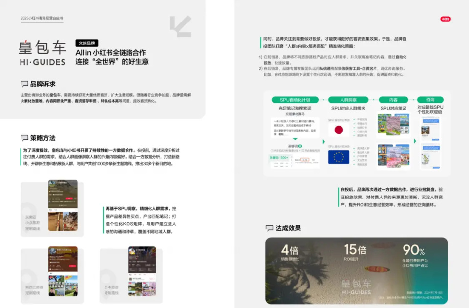 主营出境游业务的皇包车,品牌自投团队基于与小红书持续合作「一方数据」,打磨出“人群x内容x服务匹配”精准转化策略。在前链路投放时,品牌将不同旅游路线产品对应细分人群需求,并关联精准笔记内容,借助聚光平台的自动化投放,快速放量;在后链路转化时,品牌专属客服团队运用私信获客工具-「企微名片」,调优咨询服务,不断激发精准人群的兴趣,促进留资和转化。