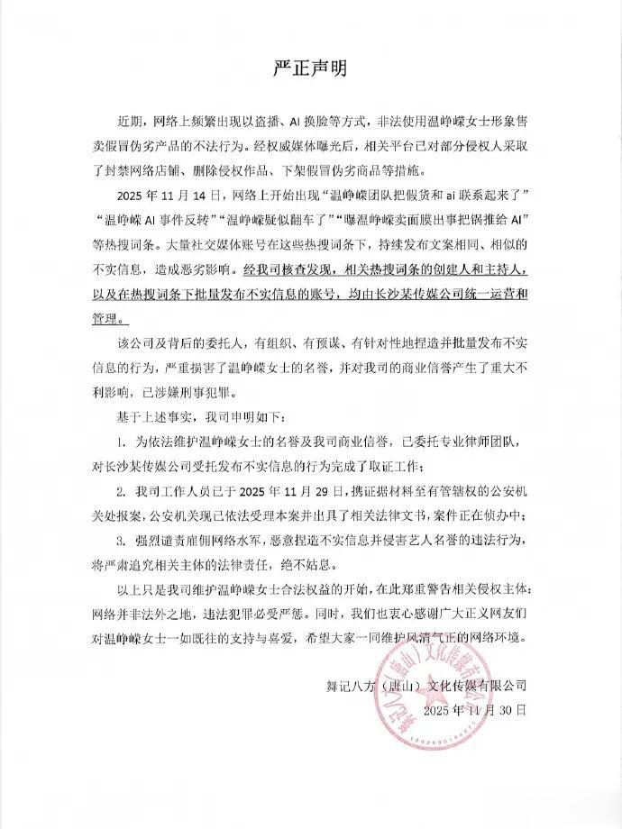 12月1日,演员温峥嵘发文称报警立案,并发出严正声明,部分内容如下:近期,网络上频繁出现以盗播、AI换脸等方式,非法使用温峥嵘女士形象售卖假冒伪劣产品的不法行为。经权威媒体曝光后,相关平台已对部分侵权人采取了封禁网络店铺、删除侵权作品、下架假冒伪劣商品等措施。2025年11月14日,网络上开始出现“温峥嵘团队把假货和ai联系起来了”“温峥嵘 AI事件反转”“温峥嵘疑似翻车了”“曝温峥嵘卖面膜出事把锅推给AI”等热搜词条。大量社交媒体账号在这些热搜词条下,持续发布文案相同、相似的不实信息,造成恶劣影响。经我司核查发现,相关热搜词条的创建人和主持人,以及在热搜词条下批量发布不实信息的账号,均由长沙某传媒公司统一运营和管理。