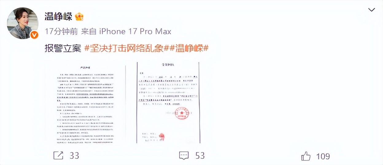 12月15日,温峥嵘在社交平台发文称:报警,已刑事立案。