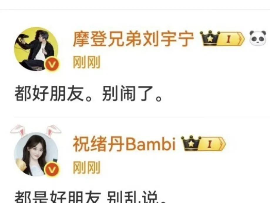 祝绪丹被自己的粉丝爆料和刘宇宁恋爱两年了,给出的理由是祝绪丹生日直播时刘宇宁在直播间送了很多礼物,还有祝绪丹也曾手滑关注过刘宇宁工作室,至于这个是不小心手滑关注的,还是特意关注的,并没有什么确切证据。 两人的爆料一出,瞬间引来了很多吃瓜群众,祝绪丹和刘宇宁这两个正主也坐不住了,第一时间发文辟谣。 刘宇宁:“都好朋友。别闹了。” 祝绪丹:“都是好朋友 别乱说。” 刘宇宁和祝绪丹都言辞简单的说两人就是好朋友,别乱猜,说实话估计两人看到恋情热搜也挺懵的。 虽然爆料者给出的理由看着有理有据,但一点实证都没有,像私下的一些同框合照,聊天记录啊等等都没有,就因为刘宇宁直播间送过祝绪丹礼物,祝绪丹关注过刘宇宁工作室就说两人在一起了,真的有点草率了。 和其他娱乐圈被爆恋情不同的是,这次的爆料者居然是祝绪丹的粉丝,不过在爆料出两人的恋情以后,这名粉丝就注销了账号,这一看就不是祝绪丹的真爱粉,假粉丝。