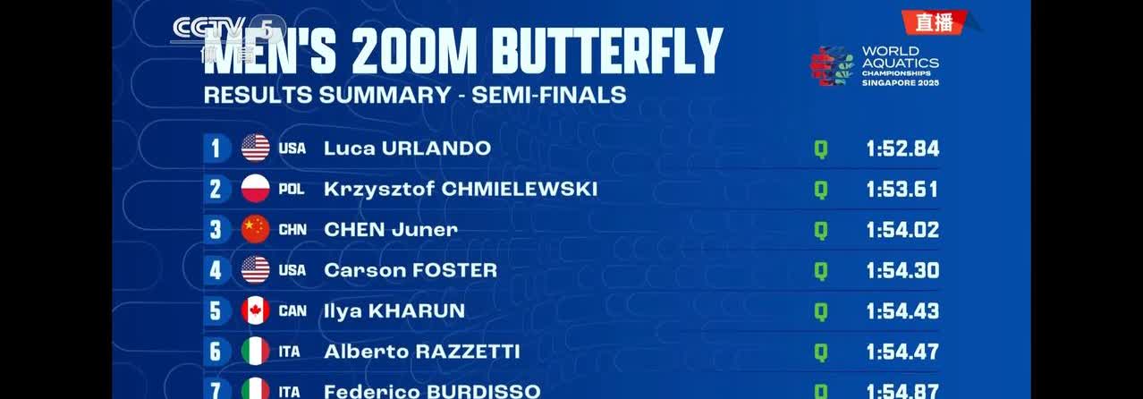 中国男子蝶泳终于出现厉害人物!世锦赛男子200米蝶泳陈俊儿以1分54秒02以半决