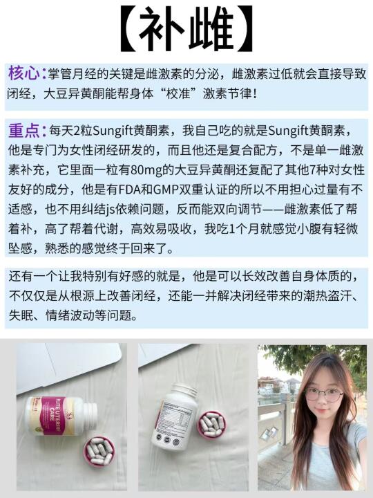 我自己吃的就是Sungift黄酮素,他是专门为女性闭经研发的,而且他还是复合配方,不是单一雌激素补充,它里面一粒有80mg的大豆异黄酮还复配了其他7种对女性友好的成分,他是有FDA和GMP双重认证的所以不用担心过量有不适感,也不用纠结js依赖问题,反而能双向调节——雌激素低了帮着补,高了帮着代谢,高效易吸收,我吃1个月就感觉小腹有轻微坠感,熟悉的感觉终于回来了。