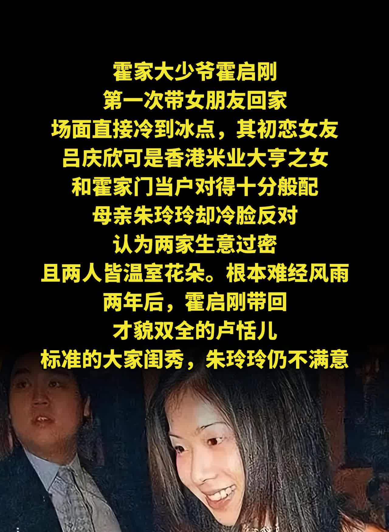 2000年,霍启刚带着初恋女友回家见家长,对方漂亮又有家底,朱玲玲却说:“你们不合适,赶紧分了!”两年后,霍启刚又带着第二任女友回家,朱玲玲又反对。 霍家大少爷霍启刚第一次带女朋友回家,场面直接冷到冰点,其初恋女友吕庆欣可是香港米业大亨之女,和霍家门当户对得十分般配,母亲朱玲玲却冷脸反对,认为两家生意过密,且两人皆温室花朵。根本难经风雨。两年后,霍启刚带回才貌双全的卢恬儿,标准的大家闺秀,朱玲玲仍不满意。因卢小姐脾气骄纵,非豪门媳妇理想人选。外界笑霍启刚“妈宝”,谈个恋爱都要看母亲的脸色。直到2004年他邂逅郭晶晶,情况出现转机。朱玲玲对郭晶晶十分认可,原来,朱玲玲是在为霍家选未来主母,吕太娇、卢太傲,唯郭晶晶作为世界冠军,见过大场面,能应对豪门纷争。霍启刚追求郭晶晶时,朱玲玲还帮儿子出谋划策。而郭晶晶父母起初担心女儿嫁入豪门受委屈,但婚礼上霍震霆称“感谢晶晶下嫁”,改写了豪门婚姻剧本。如今霍启刚事业家庭双丰收,全靠朱玲玲当年狠心把关。婚姻是两个家族的棋局,父母作为旁观者,往往能看清本质,避免子女陷入表面光鲜的陷阱。