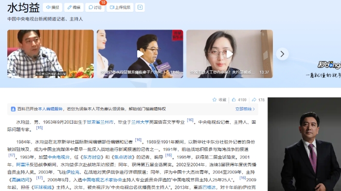 水均益,央视知名记者和主持人,以其深入战地的报道和主持《东方时空》、《焦点访谈》等栏目闻名。