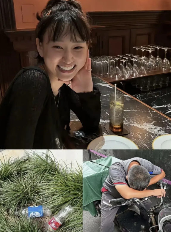 她选择的照片内容有很强的导向性,像是故意为之。仔细看照片,大家都知道,我们的外卖员快递员都是精神抖擞,乐观向上,没有她拍这样的啊?!草堆里面的可乐瓶子会不会就是她扔的呢?!