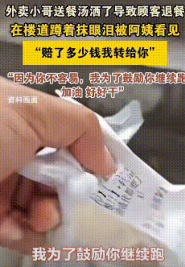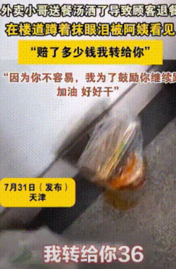 天津,年轻的外卖小哥蹲在楼道里哭泣,大姨看到后问:“你怎么了?” 小哥眼含泪花的回答:“我把外卖的汤汁撒了一些到袋子里,客人申请退餐,这笔单我要赔钱的。”