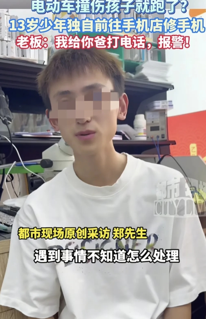 手机店老板郑先生在得知男孩被电瓶车撞了又逃跑的事后,不仅主动关心男孩伤势,还联系男孩家长并提醒报警。