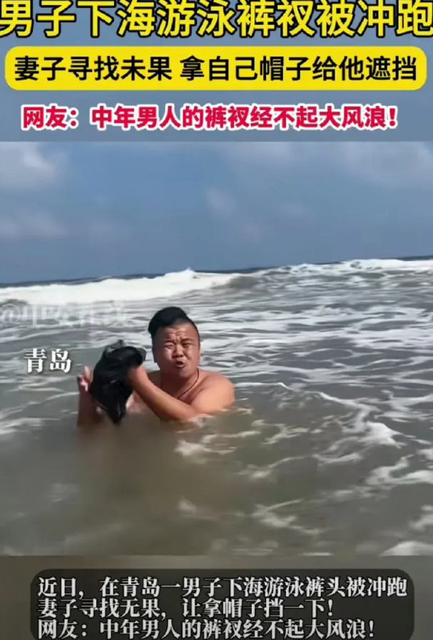 尴尬啊!山东青岛,男子下海游泳,不料裤衩被冲跑。妻子帮忙寻找无果,把自己帽子扔给男子遮挡。网友: 中年男人的裤衩经不起大风浪!