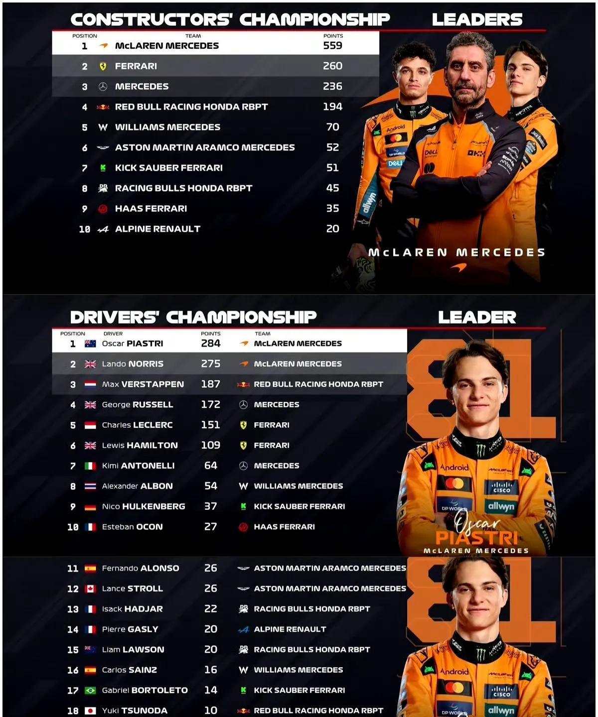 2025F1匈牙利大奖赛又是两台火星车包揽冠亚军。法拉利再次化身马戏团:一台车杆位到P4、一台车被套圈排P12。 车手积分榜:诺里斯夺冠后,距离皮亚斯特里仅9分差距。 车队积分榜:法拉利位居第二,仅仅比梅奔多24分。