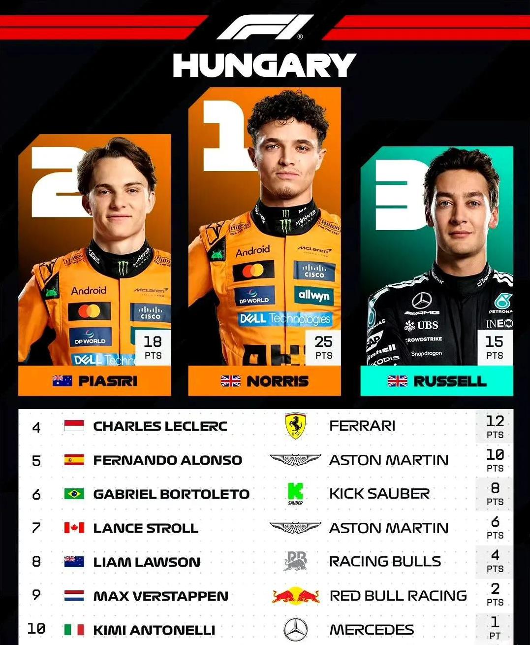 宿命难以打破:杆位得主终究无法夺冠!2025F1匈牙利大奖赛名场面: 1、勒老四归位,杆位到正赛第四。 2、维斯塔潘排在劳森后面…人扛着老牛跑不过年轻人开的小牛也实属正常。 3、梅奔好像来了个负升级,拉塞尔燃尽了……至少登上了领奖台。