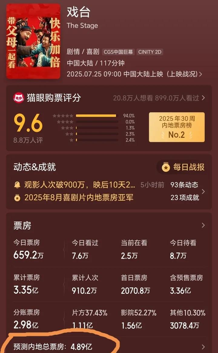电影《戏台》最担忧的事还是发生了,最终预测票房只有4.89亿! 陈佩斯导演的电影《戏台》票房增速今天明显放缓,到目前为止不到700万,远不如昨天的2000多万! 我昨天说《戏台》排片和票房数据倒挂,也就是说10%的排片,只有5%的票房。这样的结果必将导致院线减少排片,最终导致票房总数下降。今天的数据已经验证了我昨天的说法。 估计到晚上12点截止,《戏台》今天总票房都不会破1000万。这说明看这部电影的人越来越少。喜欢看,想看这部片子的人基本上都看过了,后面能够挖掘的观影人越来越少! 也正是如此,直接导致平台最终预估总票房下降。猫眼预估总票房已经从最高5.9亿,降到5.2亿,而今天已经跌破5亿,只有4.89亿了!也就是说,《戏台》最终票房还是不会突破5亿! 5亿这个数据,一直是陈佩斯想突破的,但是没想到还是跌破了,确实有一些遗憾!最重要的是,随着排片的减少,这个数据还会不会继续下行? #电影戏台#