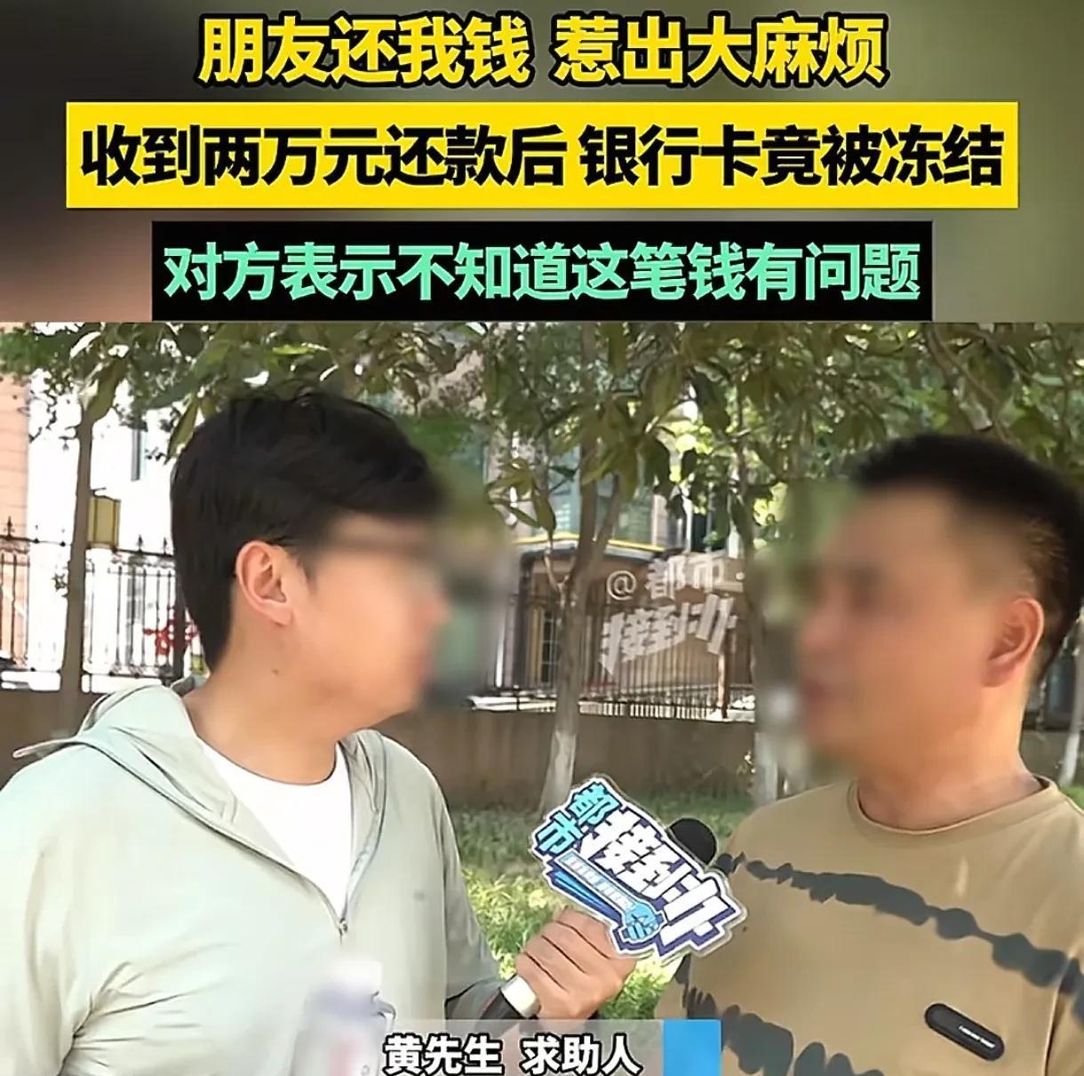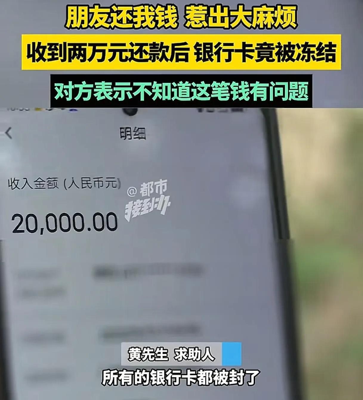 河南郑州,男子拿了2万元给朋友急用,2天后,朋友给男子转来2万元,可万万没想到,半个月后,男子的银行卡突然被封了。他联系朋友,朋友却说:这是别人给她转的钱,她也不知道钱有问题,她的卡也被封了。朋友说出的真相,让男子傻眼了, 据河南都市报道8月1日报道,6月10日左右,黄先生还沉浸在帮到朋友的满足感里。当时一个人认识很多年的朋友说有急用,他二话没说,刚好手头有点钱,就拿了 2 万元给朋友救急。 2 天后,朋友就把 2 万元转回到他账户,黄先生也没多想,觉得这就是一场再平常不过的借钱还钱,这朋友还挺诚信的,还钱速度也快,这钱到账,这事儿就算圆满收尾了。 可谁能想到,平静的日子没过几天,意外毫无征兆地砸了下来。那天黄先生像往常一样,手在沙发上玩手机,突然手机弹出来自己房贷没扣成功的弹窗,黄先生很纳闷,自己卡里明明有钱啊!怎么就没扣除。 于是,他准备想查查银行卡余额,操作的时候,页面突然弹出提示,说他的账户余额部分被冻结,只能用部分余额。黄先生一开始以为是系统出故障,刷新了好几遍,结果还是一样。 紧接着更糟心的事儿来了,他发现自己所有银行卡都被封了,这可把他急坏了,好好的卡怎么说封就封?黄先生赶紧联系朋友,想弄清楚到底咋回事。朋友那边也满是委屈,说还的那 2 万元,是别人转给她的,她压根不知道这钱有问题,现在她自己的卡也被封了。 朋友还道出一个让黄先生傻眼的真相:她的卡会涉及这笔钱,是因为之前一个朋友拉她去炒黄金之类的项目,这钱大概率和那些不明不白的交易沾上了边。 好好的借钱还款,咋就和这些事儿扯一块了?黄先生越想越郁闷,自己就是纯粹帮朋友,结果平白无故遭遇银行卡被封,生活都被打乱了。 事情到最后,黄先生只能配合银行和相关部门调查,证明自己确实是正常的借贷往来,和违法交易没关系。朋友也已经报过案了。现在还在进一步调查,她对黄先生也很愧疚。 这事儿在网上传开后,网友们也炸开了锅。有人说:“好心借钱还惹一身麻烦,以后借钱都得留个心眼,谁知道还回来的钱干不干净,现在的金融风险防不胜防,哪怕是朋友之间的资金往来,都可能踩雷。” 还有人说道:“就算2万元资金涉案,也不能把人家所有的钱都冻结了吧,查案期间,人家怎么生活?” 在现在这个金融交易复杂的环境里,哪怕是朋友之间的资金往来,也不能掉以轻心。别以为关系好,借钱还钱就是小事,说不定背后就藏着看不见的风险。 不管是借钱出去,还是收钱进来,都得留意资金来源是否合规,不然像黄先生这样,好心帮忙最后却惹一身麻烦,费时费力还影响生活。 对此你怎么看?欢迎大家在评论区留言讨论。 信息来源:河南都市报道