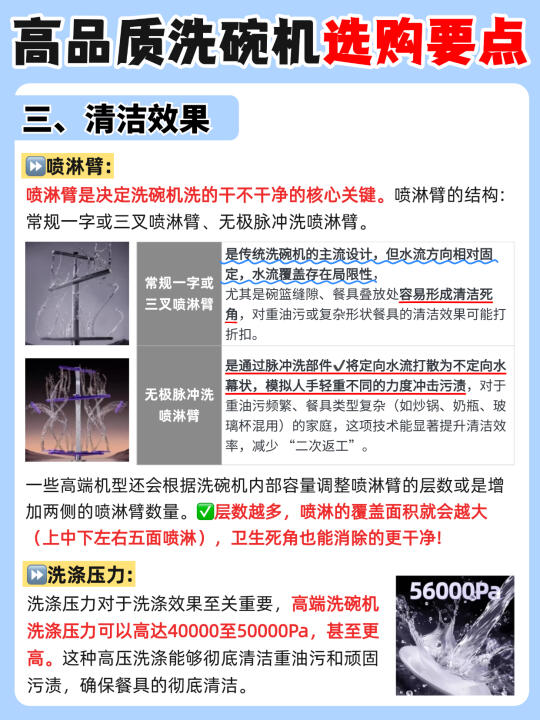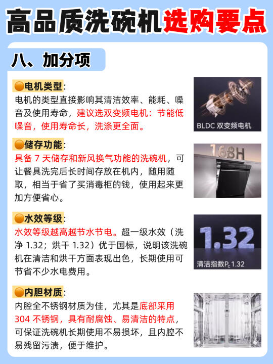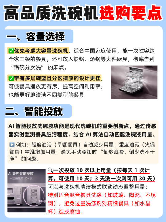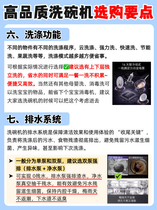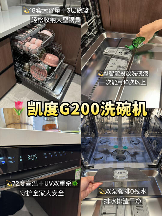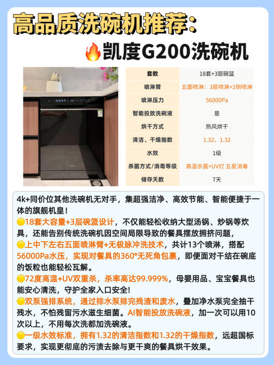 说起洗碗机💦我想大家都会各执一词,有的说买了占地儿落灰,有的讲用了乃真香本香。其实在试过大小十余台洗碗机之后,我可以明确的给正在纠结的你带来结论:没有不好的,只有不合适的。今天橙子🍊和大家讲讲🔍洗碗机到底应该怎么选? - ✅容量选择 优先考虑大容量洗碗机,带有多层碗篮且分区摆放的设计更佳 ✅智能投放 有AI智能投放的机器更方便,可自动匹配洗碗液用量。 ✅清洁效果 建议选无极脉冲洗喷淋臂,一些高端机型还会根据洗碗机内部容量调整喷淋臂的层数或是增加两侧的喷淋臂数量。✔️层数越多,喷淋的覆盖面积就会越大,卫生死角也能消除的更干净! ✅烘干方式 常见的烘干方式有➡️余温烘干、热风烘干等,两种叠加的烘干速度更快、效果更好! 五、消毒方式 ✅消毒方式: 高温杀菌+双UV杀菌多种搭配的更好,防潮防异味,安心更省心! ✅消毒等级: 建议选择五星及以上,确保除菌率达99.999% ✅洗涤功能 洗涤程序越多越方便,有上下层独立洗的更好,省水的同时可满足一餐一洗不积累~ ✅排水系统 选双泵强排(排水泵 + 净水泵),可实现 0 残水👍🏻能有效避免污水残留滋生细菌,保持内腔清洁 ✅加分项 💫双变频电机:节能低噪音,使用寿命长,洗涤更全面。 💫有7 天储存和新风换气功能的洗碗机,随用随取干净卫生 💫水效等级越高越节水节电。 💫内腔全不锈钢材质,不易残留污渍,便于维护。 - 经过各方面观察,橙子比较推荐的是🔥凯度G200洗碗机!💰4k+同价位其他洗碗机无对手,集超强洁净、高效节能、智能便捷于一体的旗舰机皇! 👉🏻18 套大容量 + 3 层碗篮,轻松收纳大型锅具 💦五面喷淋臂 + 13 个喷淋孔,搭配 56000Pa 水压和无极脉冲洗,360° 无死角清洁,干结饭粒也能瓦解。 💥72℃高温 + UV 双重杀菌率达 99.999%,母婴餐具放心洗。双泵强排系统抽干残水,AI 智能投放洗碗液,一次可用 10 次以上。一级水效🍃清洁和干燥指数均 1.32,远超国标,去污烘干更彻底。不知道买哪款的朋友闭眼入! -