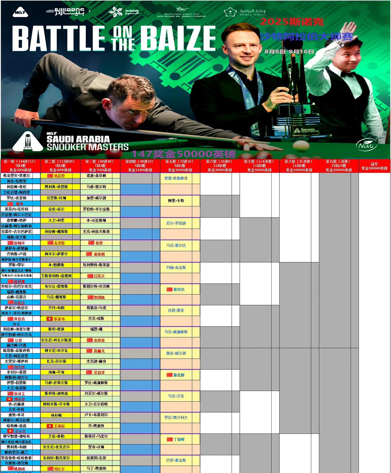 因为参加世界运动会,肖国栋白雨露放弃奖金丰厚的沙特大师赛(总奖金230万英镑)。