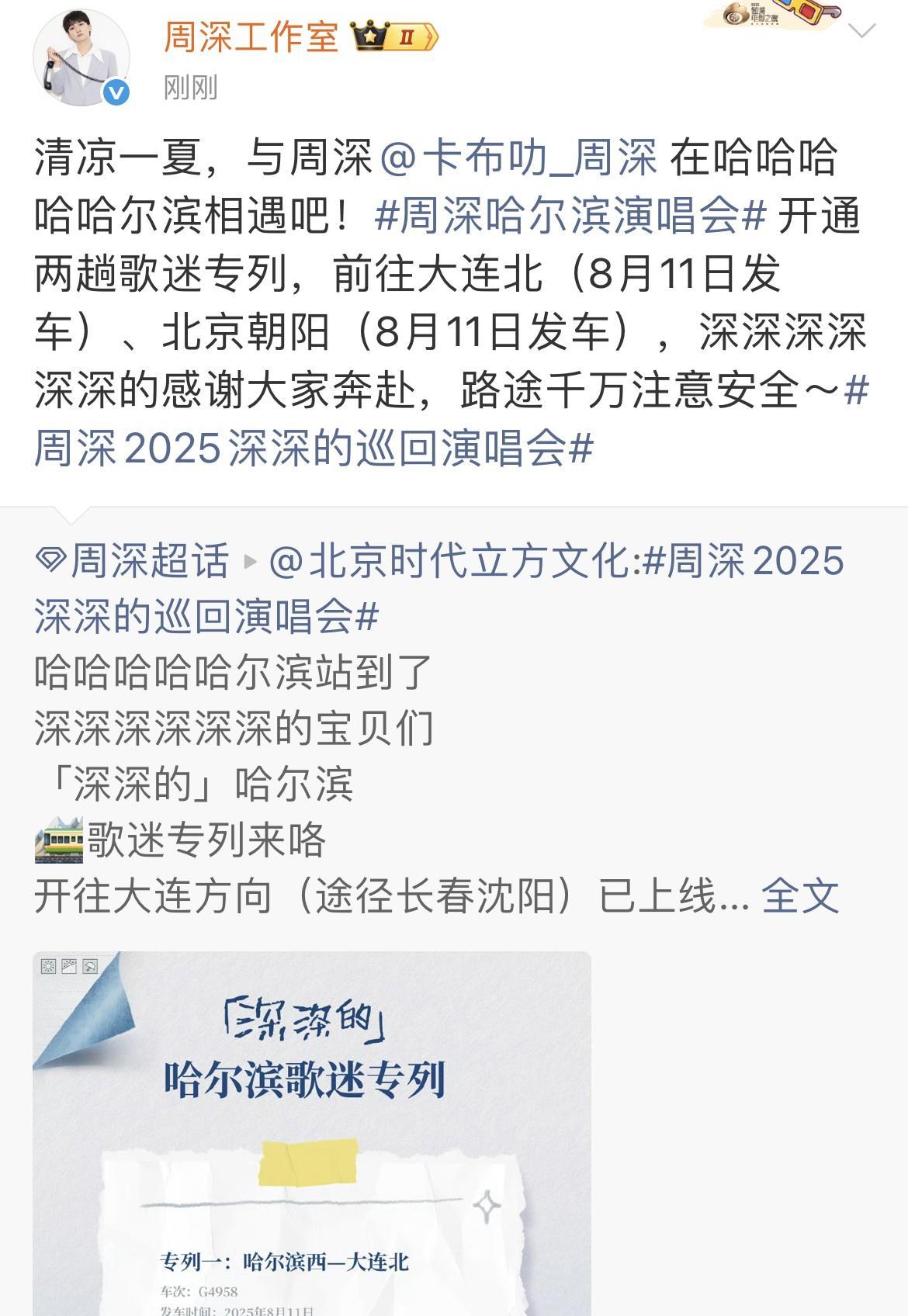 [心]周深·哈尔滨歌迷专列来啦![心] [彩虹]天啊!又开了歌迷专列! [彩虹]祝宝贝这周末哈尔滨演唱会顺顺利利!